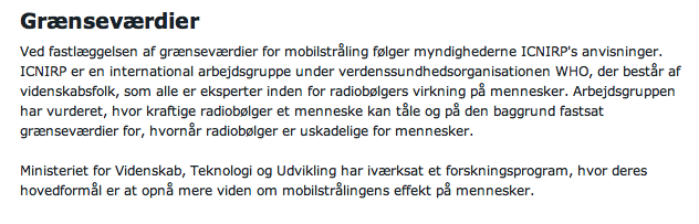 "Ved fastlæggelsen af grænseværdier for mobilstråling følger myndighederne ICNIRP's anvisninger. ICNIRP er en international arbejdsgruppe under verdenssundhedsorganisationen WHO, der består af videnskabsfolk, som alle er eksperter inden for radiobølgers virkning på mennesker. Arbejdsgruppen har vurderet, hvor kraftige radiobølger et menneske kan tåle og på den baggrund fastsat grænseværdier for, hvornår radiobølger er uskadelige for mennesker."