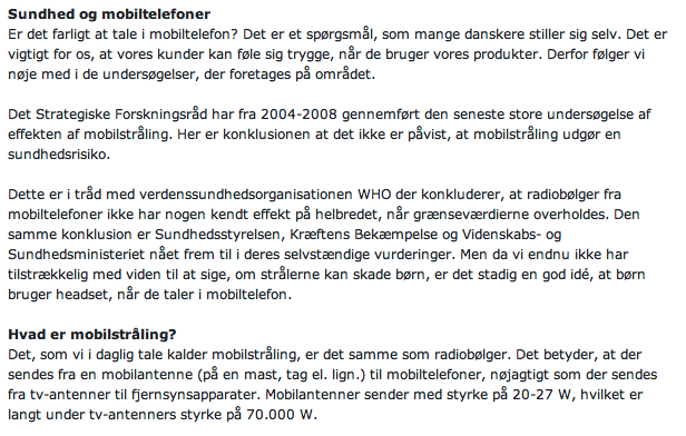 Kommentar: TDC nævner her dansk forskning, hvor der ikke er fundet sundhedsskadelige virkninger ved mobilstråling samt danske aktører, der ikke slår strålingsalarm. Hvad der ikke nævnes er: